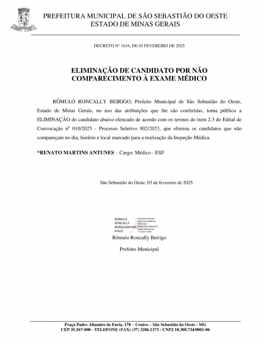 Eliminação de candidato por não comparecimento à exame médico - Decreto 1616/2025