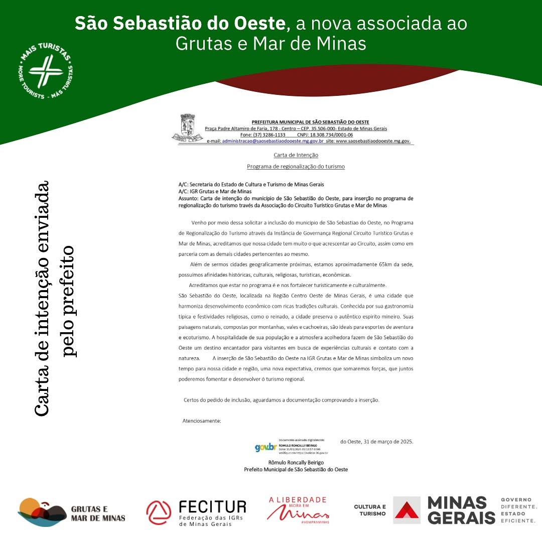 O município nos acionou com essa nova gestão e solicitou mais informações sobre o nosso trabalho e depois de nos informarmos com a Secult MG e constar que o município não estava ainda na regionalização, demos avanços nas tratativas e a partir de hoje, 31/03, São Sebastião do Oeste também é Grutas e Mar de Minas!
