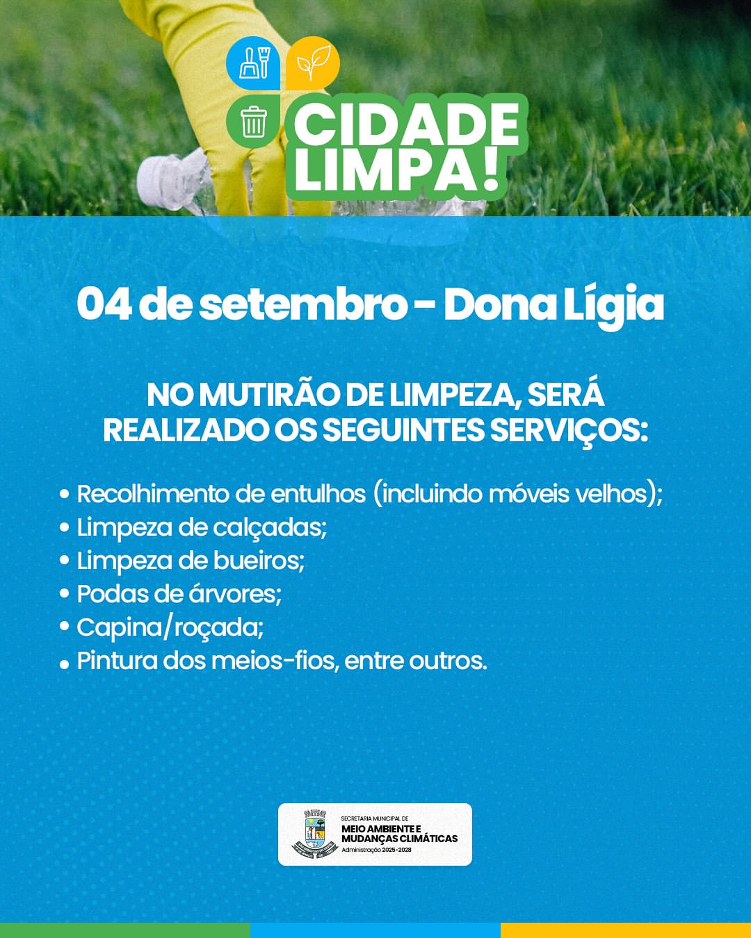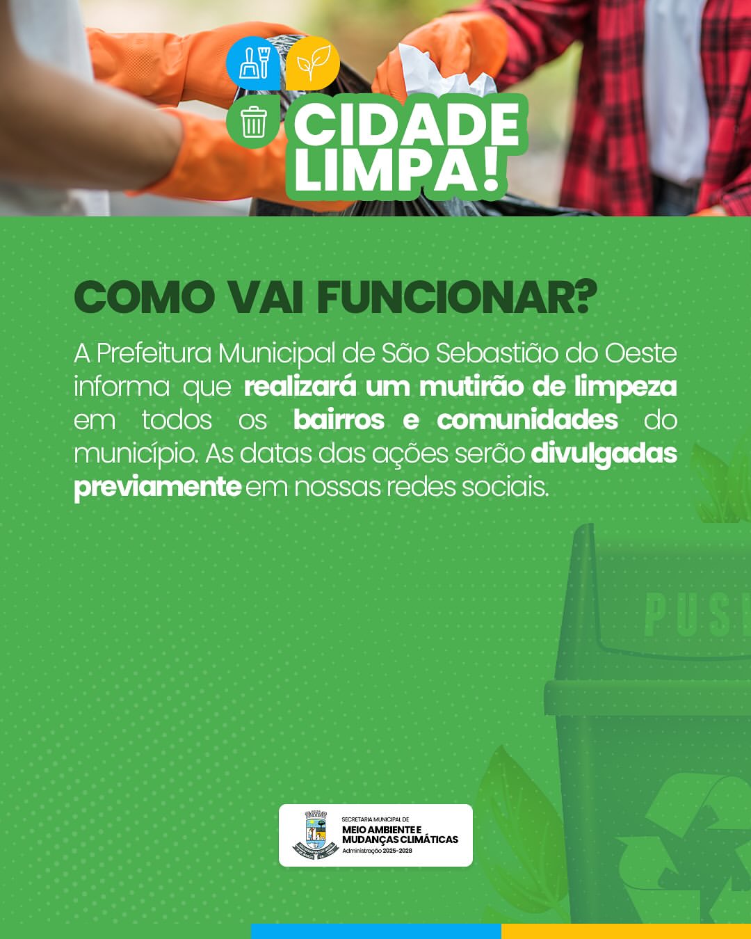 A Prefeitura Municipal de São Sebastião do Oeste, por meio da Secretaria de Meio Ambiente e Mudanças Climáticas, inicia um grande mutirão de limpeza em todos os bairros e comunidades do nosso município.