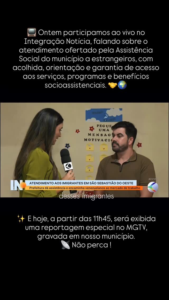 Ontem (07/01) participamos ao vivo no Integração Notícia, falando sobre o atendimento ofertado pela Assistência Social do município a estrangeiros, com acolhida, orientação e garantia de acesso aos serviços, programas e benefícios socioassistenciais.