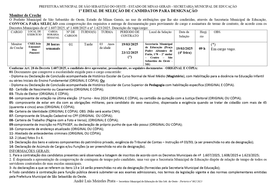Edital 01/2025 - Designação de Monitor de Creche