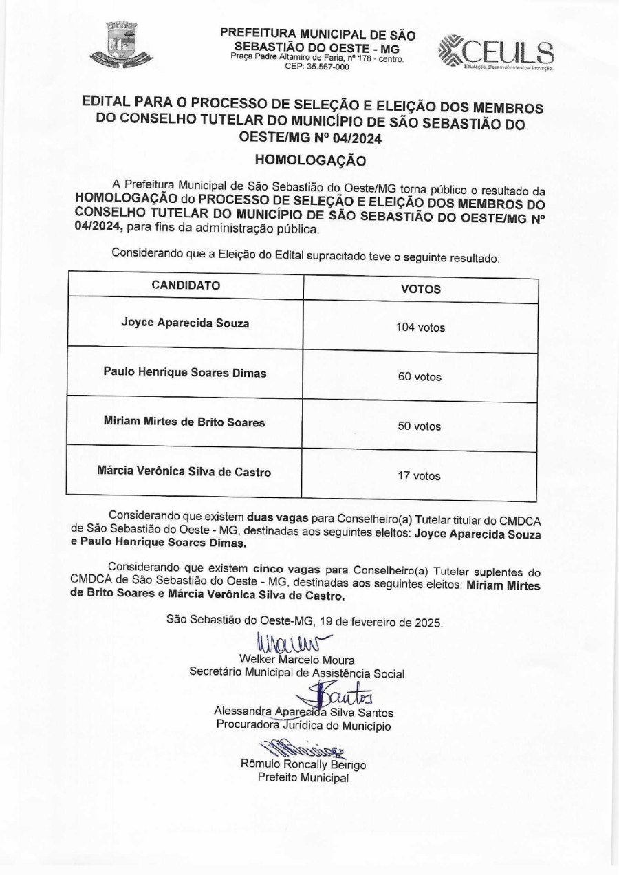 Homologação - Edital para o Processo de Seleção e Eleição dos Membros do Conselho Tutelar do Município de São Sebastião do Oeste/MG Nº 04/2024