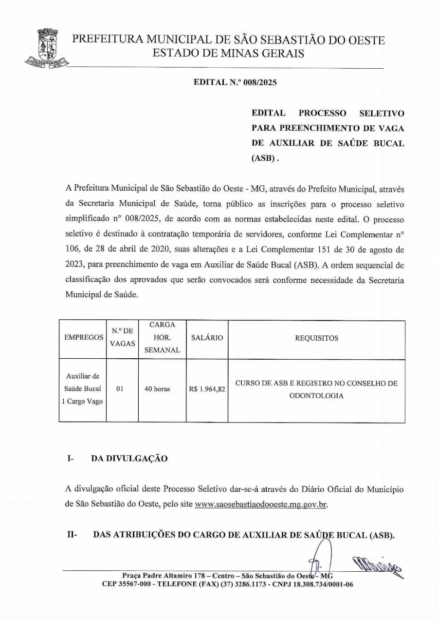 Edital Nº 008/2025- Processo Seletivo para preenchimento de vaga de Auxiliar de Saúde Bucal (ASB)
