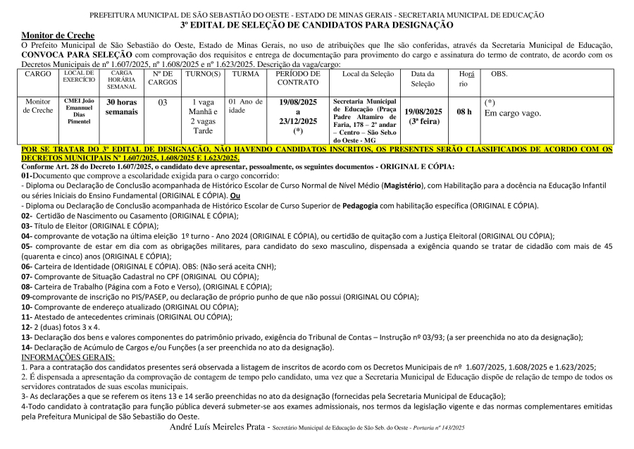 Designação de Monitor de Creche - Edital 03/2025